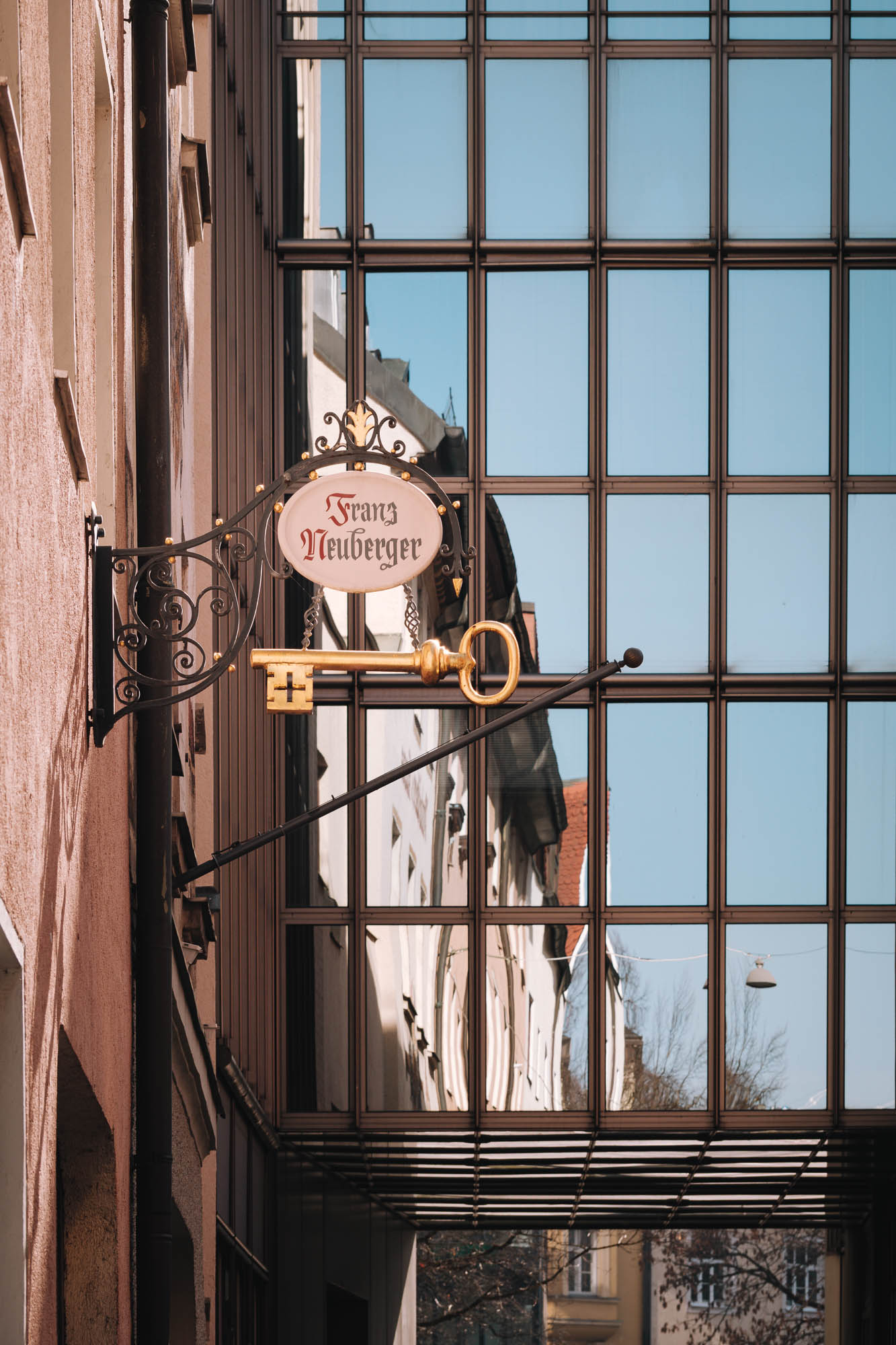 Historisches Ladenschild mit großem Schlüssel vor modernem Glasgebäude, reflektiert die Altstadt von Regensburg.