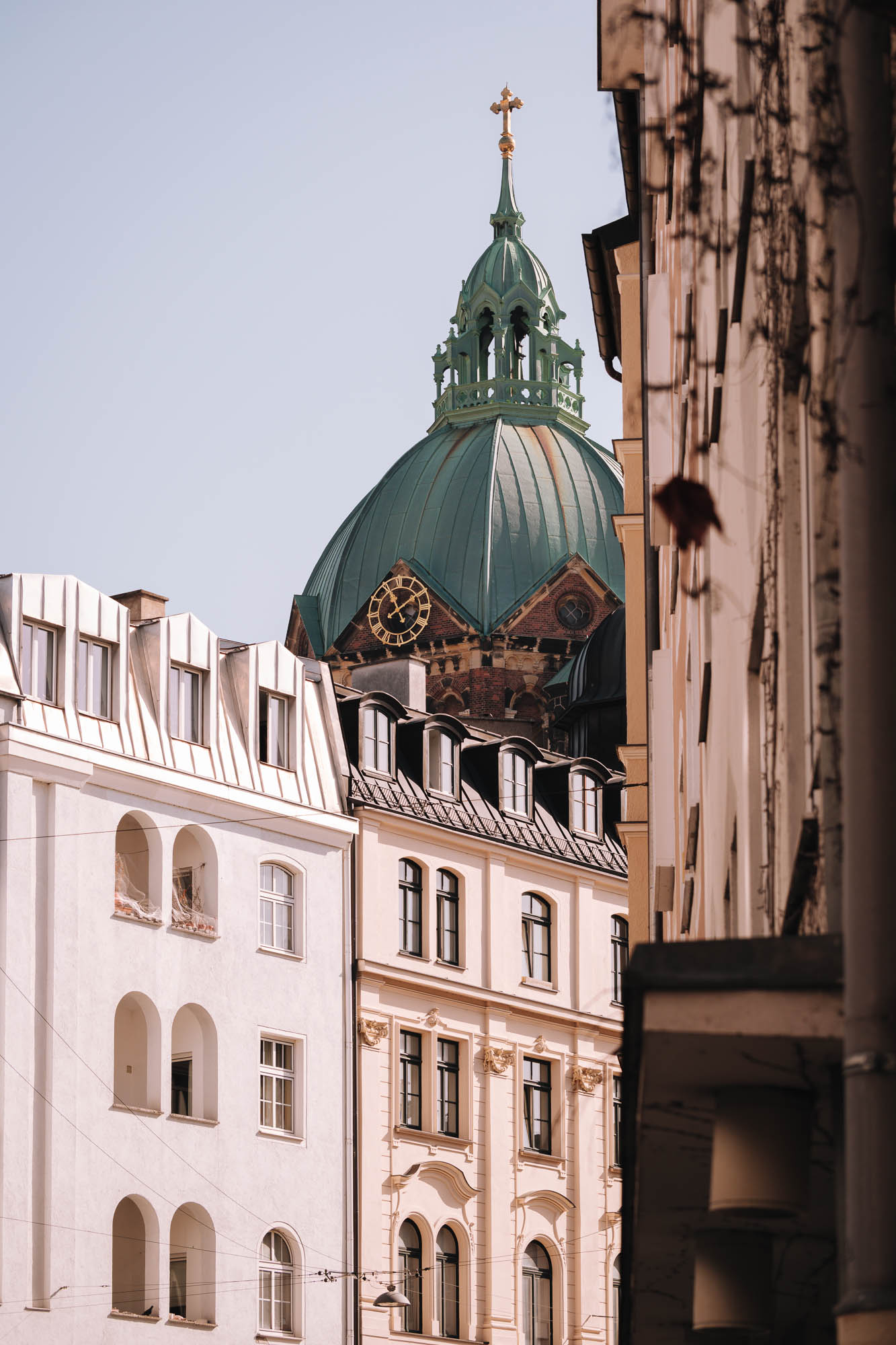 Grünes Kirchturm-Dach mit Kreuz, im Vordergrund historische Gebäude, klare Himmel im Hintergrund.